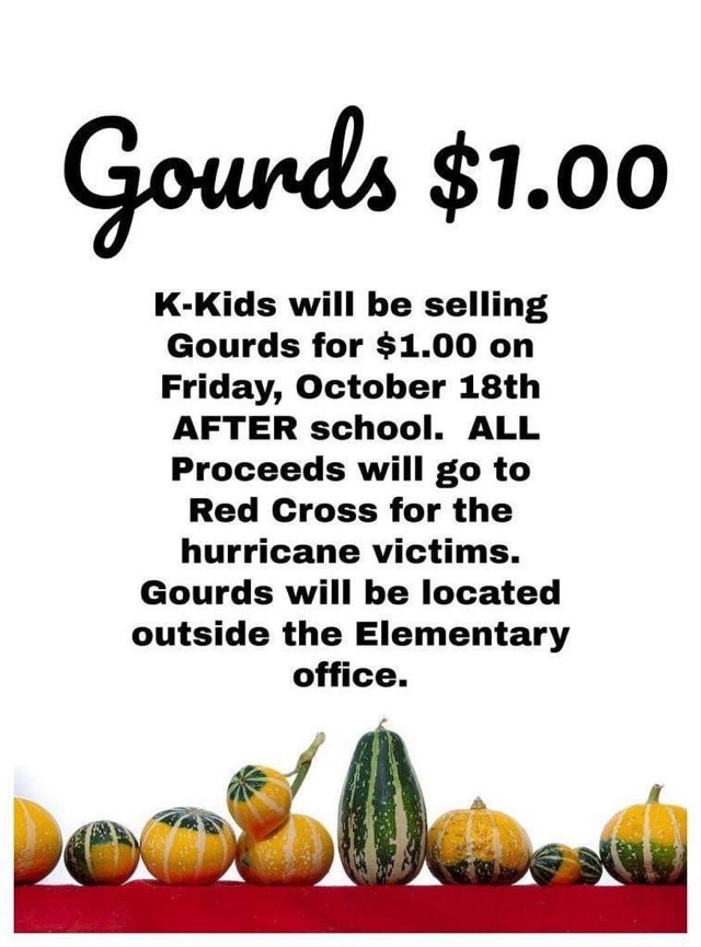 Elementary students will be selling gourds for one dollar each on October 18th, after school until 3:30 PM. The sale will take place outside the elementary office. All proceeds are set to benefit the Red Cross in aid of hurricane victims.
