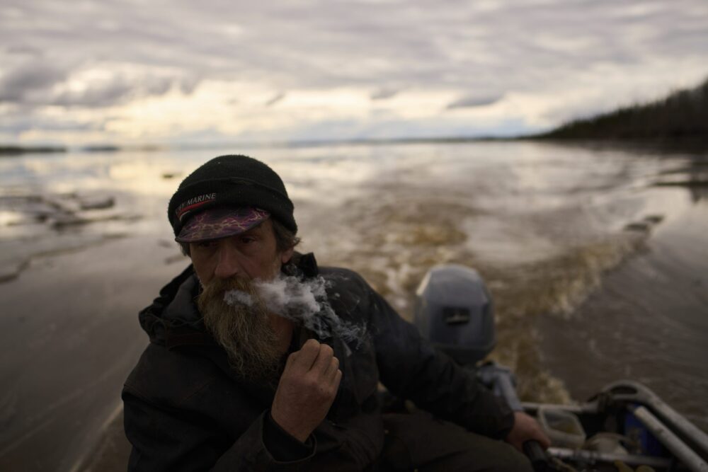 When he spots one, he hops into his wooden motorboat and roars toward it, chainsawing any roots or branches that might still be attached, a hand-rolled cigarette never far from his lips. Then he drags the log with a rope toward shore, where eventually it will be used in the community here in central Alaska.