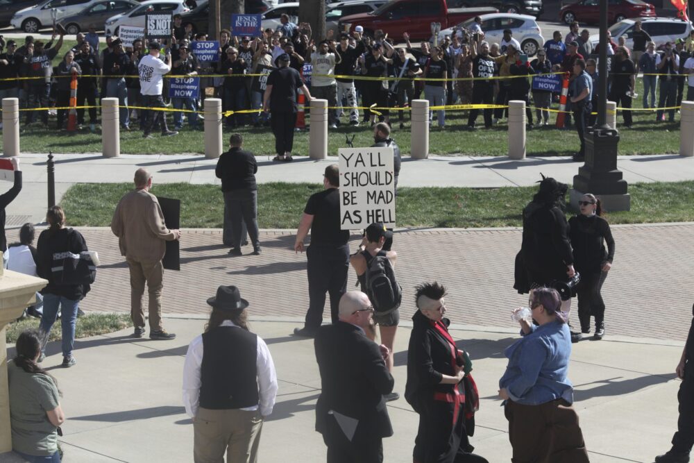 About 30 members of the Kansas City-area Satanic Grotto, led by its president, Michael Stewart, rallied outside the Statehouse for the separation of church and state. The group also protested what members called the state’s favoritism toward Christians in allowing events inside. Gov. Laura Kelly temporarily banned protests inside, just for Friday, weeks after Stewart’s group scheduled its indoor ceremony.
