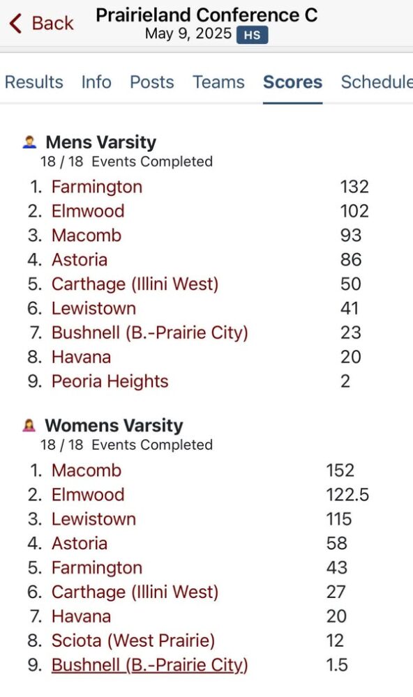 Team scores from the Prairieland Conference Track and Field Meet. Congratulations Bomber Girls, team Champions! #OnceABomberAlwaysABomber