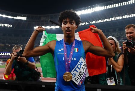 TOKYO (Reuters) -Italy’s Mattia Furlani underlined his status as the coming man in long jump when he won the world title with a personal best leap of 8.39 metres on Wednesday, as big favourite Miltiadis Tentoglou failed to make it to the second round of jumps.