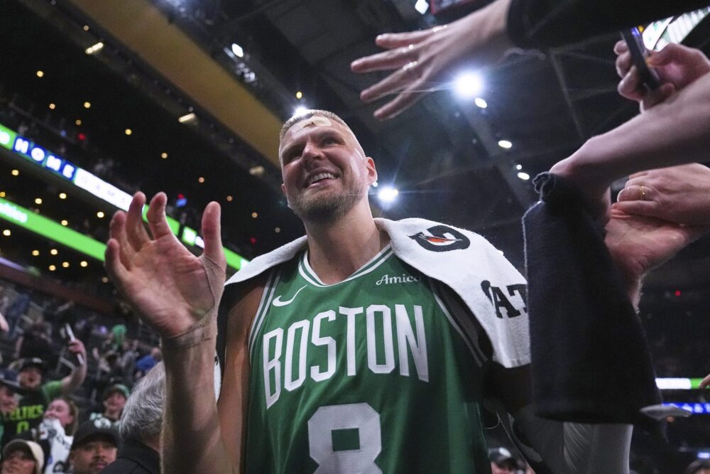 BOSTON (AP) — With blood pouring from his forehead as he ran off the court, and a towel pressed against the wound as he headed to the locker room, Celtics center Kristaps Porzingis couldn’t help but smile.
