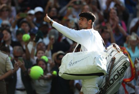 LONDON (Reuters) -Carlos Alcaraz was in no mood to suffer probably the biggest upset in Wimbledon history as he ended world number 733 Ollie Tarvet’s hopes of a fairytale victory to reach the third round with a clinical 6-1 6-4 6-4 win on Wednesday.