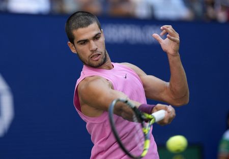 NEW YORK (Reuters) -Second seed Carlos Alcaraz took down 24-times major winner Novak Djokovic 6-4 7-6(4) 6-2 with clinical precision to reach the U.S. Open final on Friday, prevailing in a blockbuster showdown that packed the house at Arthur Ashe Stadium.