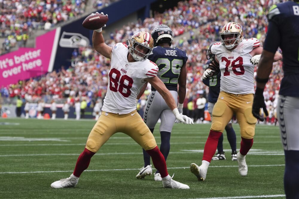Tonges entered the game having never caught an NFL pass. He finished with three receptions in relief of injured All-Pro tight end George Kittle and came down with a 50-50 ball from a scrambling Brock Purdy for a 4-yard TD. Seahawks cornerback Riq Woolen got a hand on the ball, but it bounced off him and Tonges grabbed it.