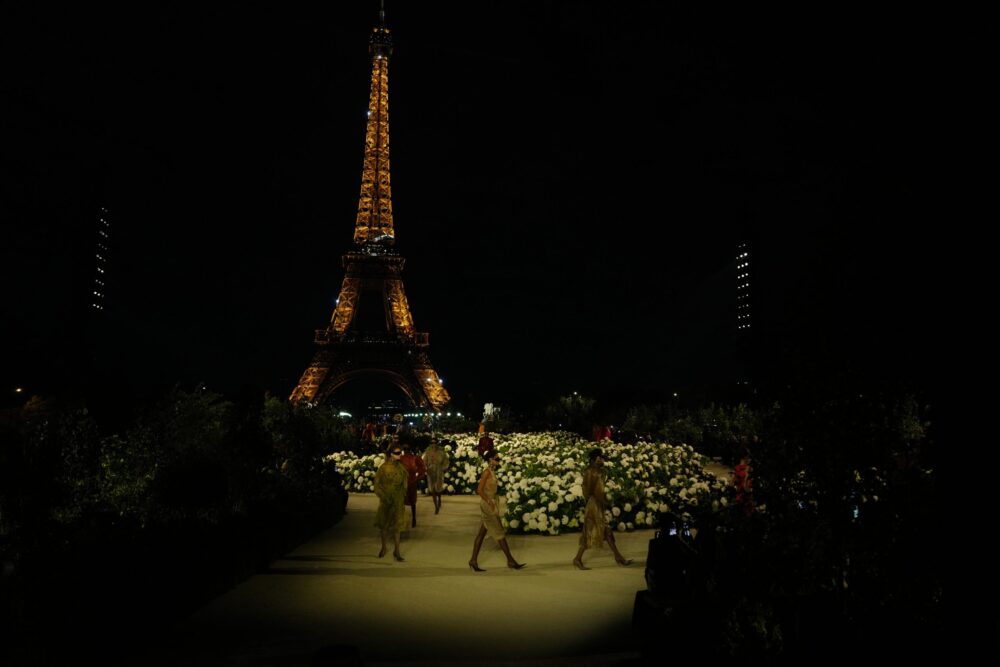 Floor-sweeping gowns rippled with frills, evoking 1970s archival pieces and petals unfurling at twilight. They weren’t garments so much as visual arguments — “beauty as plural,” the house notes declared — gowns that embodied Vaccarello’s belief that esthetics are a language.